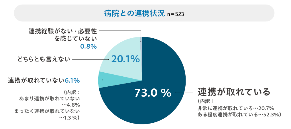 今回の調査では、病診連携が「取れている」と答えた開業医は約7割と一見すると高い結果に。しかし、「非常に連携が取れている」のは約2割にとどまり、多くのクリニックではまだ「理想的な病診連携」には課題があると考えられます。さらに、診診連携や介護との連携はそれぞれ「非常に連携が取れている」と回答した開業医は1割以下でした。