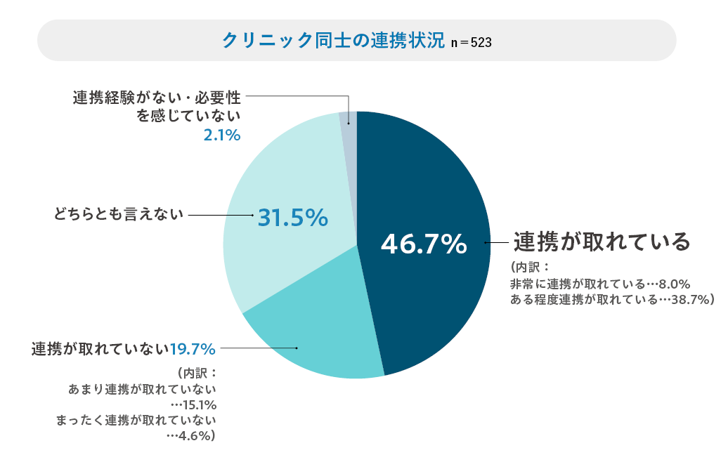 クリニック同士の診診連携では、医師会のつながりを活用している声が多く、医療介護連携ではケアマネジャーを介した連携に取り組んでいるという回答もありました。