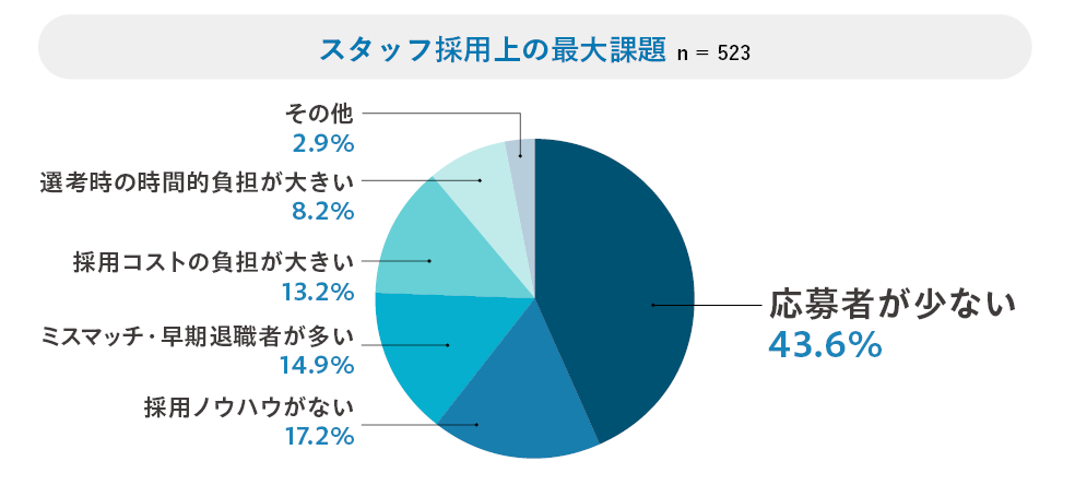 その悩みの内訳(スタッフ採用上の最大課題)をひもとくと、特に「応募者が少ない」という声が目立ちます。他の理由と比較しても圧倒的に高く、全体の約4割が回答しています。次点以降は、「採用ノウハウが少ない」「ミスマッチ・早期退職者が多い」と続きます。