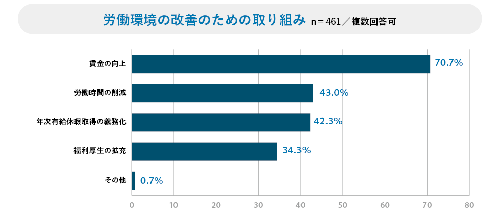スタッフの労働環境改善の主流は「賃金上げ」と「ワークライフバランスへの配慮」